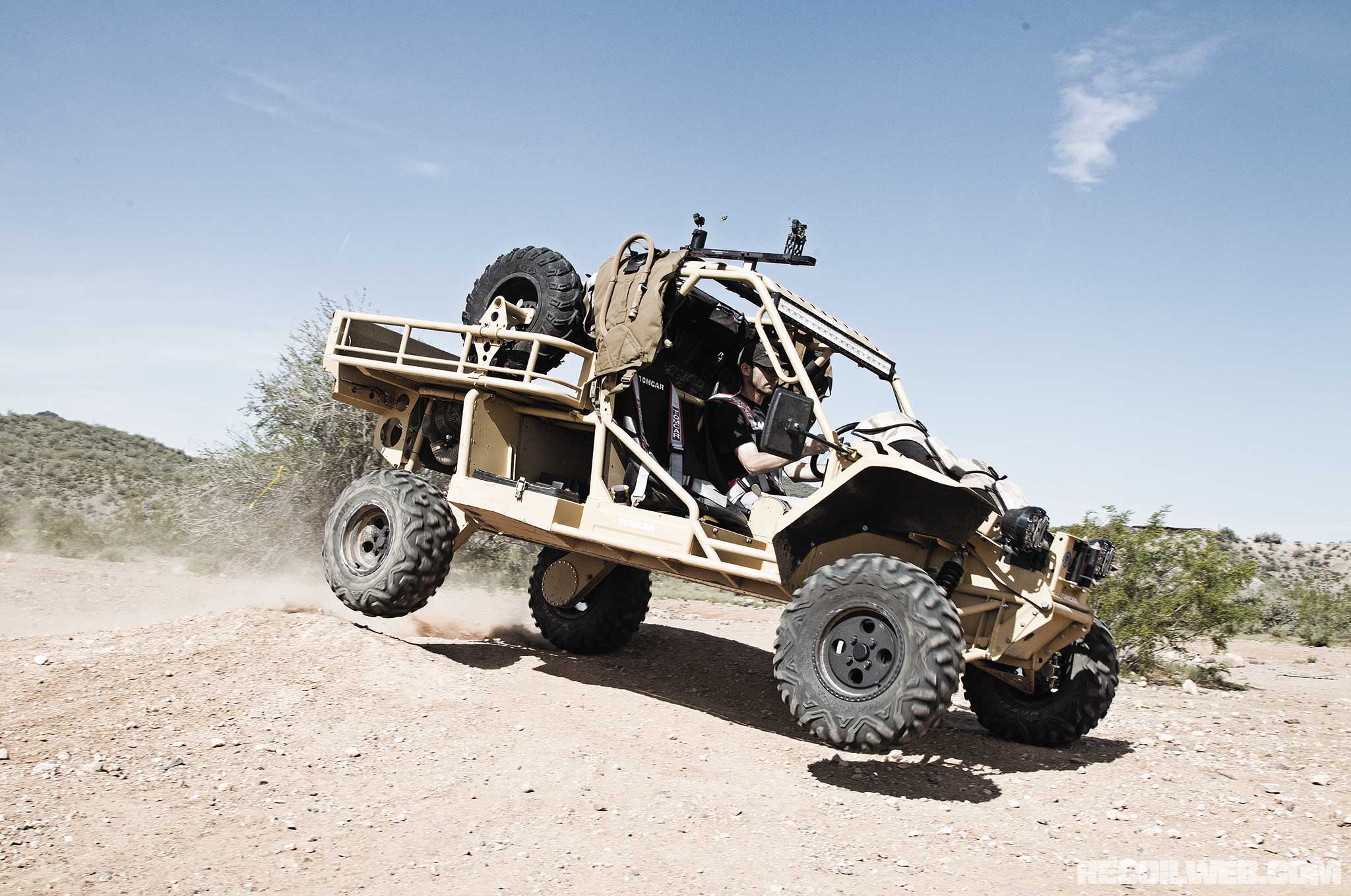 Featured 2009 Tomcar TM5 – Dirty Deeds John Schwartze August 16, 2016 Join the Conversation At RECOIL, we review every product fairly and without bias. Making a purchase through one of our links may earn us a small commission, and helps support independent gun reviews. Read our affiliate policy. Find out more about how we test products. From Desert Dunes to Asphalt Jungles, the Tomcar Proves that Big Things Come in Small Packages Photography By Henry Z. De Kuyper Make: Tomcar Model: TM5 Year: 2009 Engine: 1.4L Diesel Drivetrain: 2WD Wheelbase:101 inches If at first blush you thought this was just another sandrail, dune buggy, or UTV, we regret to inform you that you couldn't be more wrong. While it could be used to haul coolers and ditzy girls while you're hanging out at Glamis listening to Crazy Town, bro, the Tomcar is a military-grade off-road vehicle that's the culmination of progressive engineering and practical accessorizing. In other words, when shit gets hairy in the field, the guys at Tomcar have anticipated the contingencies and designed the vehicle around them. While the Tomcar is available to the public, the TM5 model we're showing you is an example of one created as part of a fleet that was deployed in South Asia and outfitted with several non-standard features for that type of environment. A major problem currently faced in designing a vehicle for combat is the IED threat. A vehicle is already a moving target, and while the obvious reaction to increase armor might make sense on paper, in battle conditions it's often proved to make vehicles larger and slower moving targets, which are obliged to run on predictable routes. The Tomcar's designers took a different approach creating a vehicle that is evasive, agile, and carries a very high payload for its size. It's hard (but not impossible) to hit a target that's small, quick, and can go off the map to avoid IEDs altogether. Initially conceived as an infantry mule, the Tomcar is resilient and powerful enough to carry men and supplies to the front line, and carry wounded out — something larger vehicles can't do in certain situations. One of its most unique features is its frame. This is no bolt-together Erector Set deal. Over 300 pieces have been seamlessly welded together. Several different grades of steel are used throughout the frame's construction for increased durability at stress points. Lighter varieties are used in other areas to keep the overall weight down and maintain a low center of gravity for balance. The side steps that extend beyond the width of the cab also serve to protect occupants during a rollover. With 15 inches of ground clearance and a standard 1,200-pound payload for the diesel engine (shown), the Tomcar TM5 is built to traverse rough terrain, especially when hauling a heavy load. An aircraft-grade, full-length aluminum skidplate under the belly helps prevent debris from slowing the momentum of the vehicle during travel. The rear swing arms and longer-than-average chromoly A-arms in the front allow for 13 inches of suspension travel. You might be asking yourself, “Why chromoly? That's soft.” Exactly. It's meant to absorb any impact energy so you can keep going. A bent A-arm will help you GTFO. A broken one will leave you stranded. The final drive is part of the rear swing arm system, which allows for a greater degree of movement than a typical rear A-arm system — plus it's encased in a sealed oil bath. One of the most vital occurrences in the field with vehicles is maintenance. Things break, but the Tomcar is meant to keep going even if they do. In combat situations, the less time spent making repairs, the more time you're in the fight. Ease of accessibility with Tomcar's components keeps downtime to a minimum. An exposed beltdrive, various symmetrical parts that can be interchanged on either side, and rebuildable parts where just the affected item can be replaced (rather than having to replace the entire unit), such as ball joints and coilover shocks, help keep driver and passengers on the road longer. You've probably wondered what's powering the TM5. A four-stroke 1-liter four-cylinder gas engine or four-stroke 1.4-liter diesel engine is connected to a high-low transmission. You might think that's a weak combo, but remember, keeping things light is also what keeps this little devil quick and allows it to tow approximately 1,800 pounds. The Tomcar is not four-wheel drive, which adds to its fuel economy, traction, and power-to-weight ratio. A locking differential that can be manually engaged acts as a positraction to turn both rear wheels to get out of tough spots or operate one wheel should there be a loss of power to the other. An optional second 7-gallon fuel tank is also available, doubling the range to 200-300 miles, depending on road conditions. Like the symmetrical components, these redundancies are meant to keep you moving. Four-wheel power assisted disk brakes are another feature that'll give you plenty of stopping power. With a base price of around $20,000, we think you'll get a lot of bang for your buck with the Tomcar, as well as a long service life. It continues to see action in combat theaters rigged up for everything from an unmanned ground vehicle to a troop and supply transport. If NATO, the British Army, and Israeli Army see fit to add it to their arsenal, we think you'll be plenty satisfied with how well it performs in rough conditions, whether it's as a rugged commercial vehicle or a fun off-roader for vacations. Fun Fact The Brits use the TM5 in Afghanistan to pick up air-dropped 1-ton pallets by running the winch cable over the cab, hooking the load, and pulling it up a ramp into the bed. Wheels/Tires Reinforced steel wheels with aftermarket tires for sand, mud, and snow (shown). Standard are aluminum wheels with 25×8-12 6-ply, front; 26×12-12 10-ply, rear. Headlights Make: KC Model: Pro Sport HID 6-inch Driving Lights MSRP: $547 URL: www.kchilites.com Front Packs Make: C
