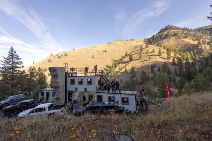 It’s a cold morning in Idaho, about 3 hours north of Boise. The crisp frigid air clings to your skin like a wet shirt, as a small fire crackles nearby and fights to spread a little bit of warmth to the men huddled around it. Behind you is a stack of shipping containers, arranged like LEGOs with ladders, shooting ports, and railings. In front of you is mountainous terrain that drops away quickly then climbs back up to a crest in the distance, dotted with steel targets as far as you can see.