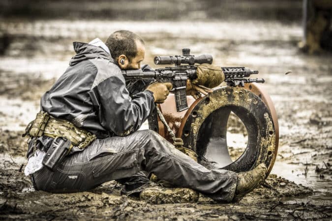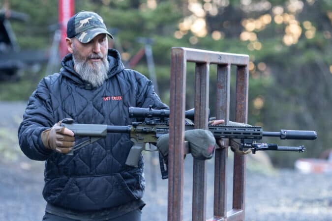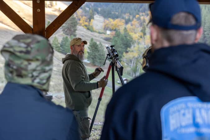 A man stands before you and your fellow students for a high-angle precision shooting course — today all civilians but more typically hard-charging, snake-eating, freedom-defending Tier 1 operators. He’s tall, with a carefully trimmed beard and clear voice. His pants are standard-issue cool-guy Fjallravens, but they’re heavily worn from kneeling on and scrambling over rocks and mountaintops.