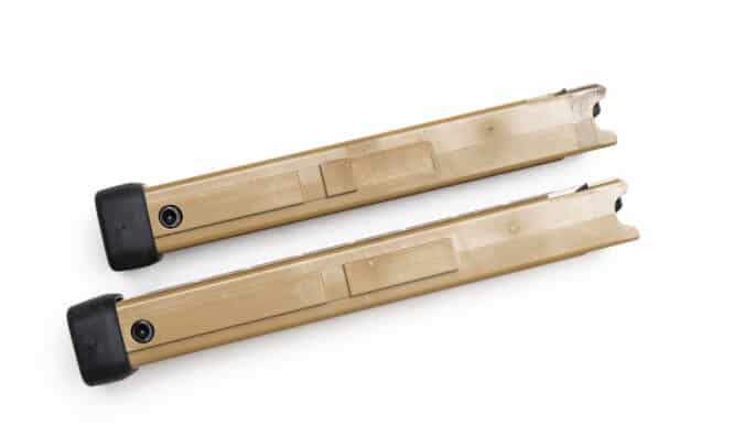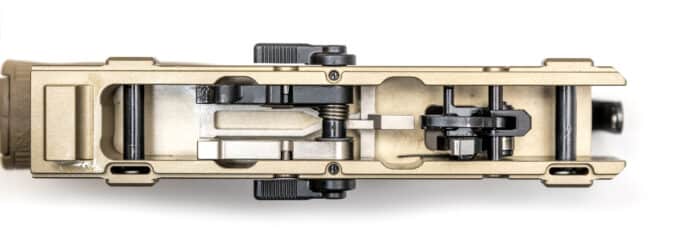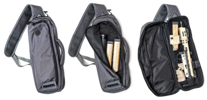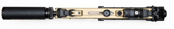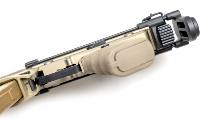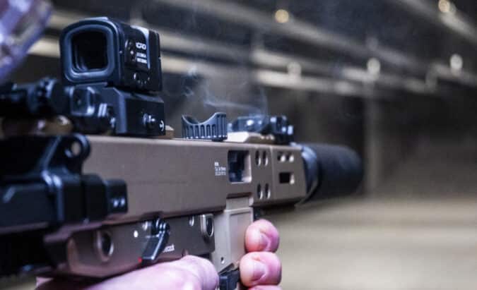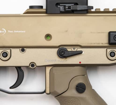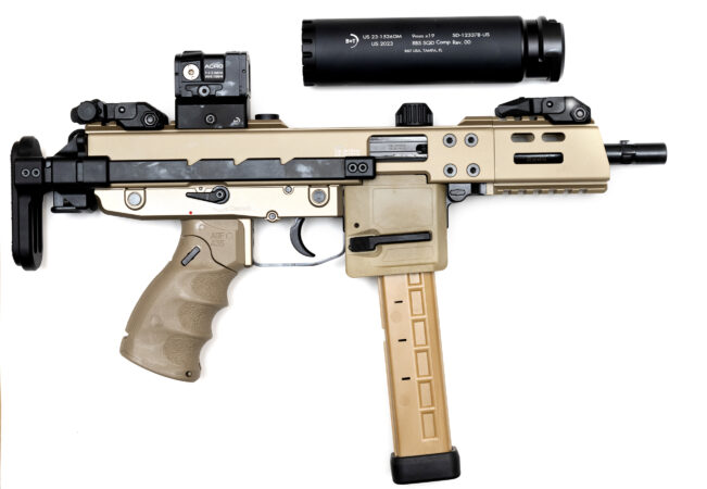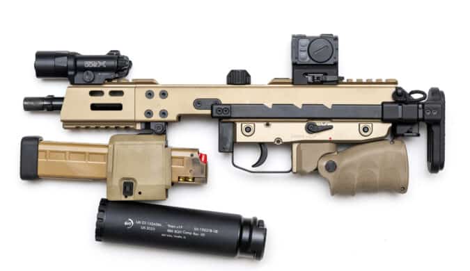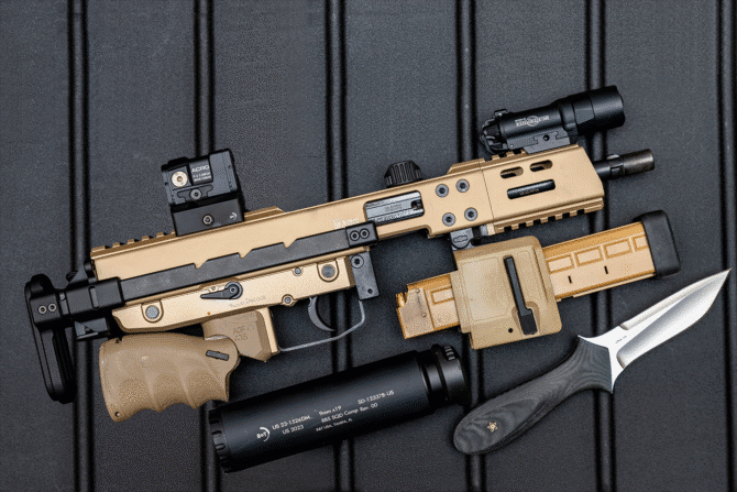 Reviews The B+T KH9 Covert: Folding Firepower Dave Merrill March 3, 2026 Join the Conversation At RECOIL, we review every product fairly and without bias. Making a purchase through one of our links may earn us a small commission, and helps support independent gun reviews. Read our affiliate policy. Find out more about how we test products. Everyone loves a folding subgun. If it’s not the kid in Robocop 2 with a blue DEB M21, then it’s an old SHOT video of Magpul’s Drake Clark snapping out the FMG-9. At one point, we’d have declared the heyday of these to be in ’80s action movies, but nay, that time is actually right now. Folding guns have always been cool, but now they’re more numerous, much better, and more practical. This one comes from B+T — the KH9 Covert. And like any Swiss company, B+T does it with both style and panache. The official story is the KH9 Covert was developed to be part of a pilot Escape and Evasion kit; it could only be so big or else it wouldn’t fit. The real story underpins the name itself: KH stands for “Karl’s Hobby.” Karl Brügger himself says, “I just like the idea of a folding magazine and a folding handgrip that will turn a 9mm carbine into the most compact package available …When I was a young boy, I saw the film Lost Command with Anthony Quinn and all the legionaries had the SMGs with the folding magazine, and I thought that I just had to have one.” Simply put, the KH9 Covert was going to be made anyway, but rather than being a hobby, it found a home inside ejection seats. B+T KH9 COVERT SPECS Caliber: 9x19mm Weight Unloaded: 5.438 pounds Magazine Capacity: 25, 30 BARREL LENGTH: 6.25 inches OVERALL length: 22.8 inches OVERALL WIDTH: 1.75 inches HEIGHT (open): 7 inches MSRP: $2,995 Accessories: Aimpoint ACRO P-2: $599 B+T Mount: $75 SureFire X300T-B: $369 B+T RBS9 SQD Compact: $650 ACTION & CONTROLS The closed-bolt blowback action itself comes from B+T’s original KH9, produced in 2015. Most 21st century designs have a forward charging handle along either side of the receiver, but in order to deal with some very specific width requirements, B+T decided to go over the top. This not only solved the issue of minimizing its footprint but also ensured that the Covert 9 was fully ambidextrous. The charging handle, or rather knob, is reminiscent of the Israeli Uzi, providing a throwback feel to this otherwise modern machine. The bolt lock is also located on the top of the receiver, and while ambidextrous, it’s not exactly an easy reach. The bolt of the KH9 Covert can still be locked back with one hand, but it takes a little practice to do well. It doesn’t lock back on an empty magazine; while this is a non-starter on a rifle like an AR-15, we’d argue it falls into the “nice to have” category for pistol-caliber carbines. Interestingly, the KH9 Covert has a double-action/single-action trigger; it’s not just an AR-15 trigger shoved into a PCC. In the normal course of operations, when the charging handle is racked an internal striking mass is locked back — think of it like a hammer going back on a DA/SA pistol like a Beretta M9. With the release of the trigger, this block is released and hits the firing pin, making the gun fire. The safety selectors are mirrored, and this model has safe, fire, and a decocker. Yes, a decocker like the Italian Spectre M4 subgun of yesteryear. Some models of the KH9 dispense with a “safe” position entirely, allowing the much heavier double-action trigger pull to serve against negligent discharge. And we really mean much, much heavier — while the single-action pull consistently broke right around two pounds, the double-action pull was completely off our scale, which maxes out at 13 pounds. The bag has enough space for the gun, silencer, several spare mags, and some ammo to boot. As a neat additional feature, the KH9 Covert has a small indicator on the left side of the receiver to let you know if the striking mass is locked to the rear or not. If it’s showing green, you’ve got a double-action trigger to pull. While some KH9 Covert models don’t have accessory mounting capabilities beyond the Picatinny rails on the top and bottom, this one features one full and two half M-LOK slots on the sides of the stubby handguard. FOLDING UP The most eye-catching aspect of the KH9 is the ability to fold its own extremities down tight. Everything is based around having an incredibly tight profile while still being quick to deploy. The pistol grip swings back and out of place by depressing a button on the left side, and the magazine well folds forward by pushing a latch snugged into the rear of the magwell. The buttstock can simply be pulled out. Folding it back up takes a little more time, but presumably you’ll only be doing that when all the action is complete. The magazine sits flush with the muzzle when in the smallest configuration. While all APC9 magazines are functional with the KH9 Covert, B+T made a special magazine specifically for when it’s in the stored position. As a 25-round magazine instead of a full 30, it’s already shorter, but B+T went a step further. This customized magazine also has a shaved spine, intentionally allowing the magazine to be over-inserted into the magwell when folded for additional space savings. To put the magazine in the stowage position, with the magwell folded simply insert the magazine until it locks, and then depress the release to allow it to move a few inches more. Now the magazine will sit no further forward than the three-lug adapter on the muzzle. B+T designed the magazine to float in this position, so all you have to do to make it ready is swing the magwell back into place; the magazine slides down to the locked position as the locking mechanism clicks it all together — no buttons to press or latches to muck with. The 25-round mag (top) has a shaved spine to allow for over-penetration in the magwell when stowed. Because the latch is located in a pos