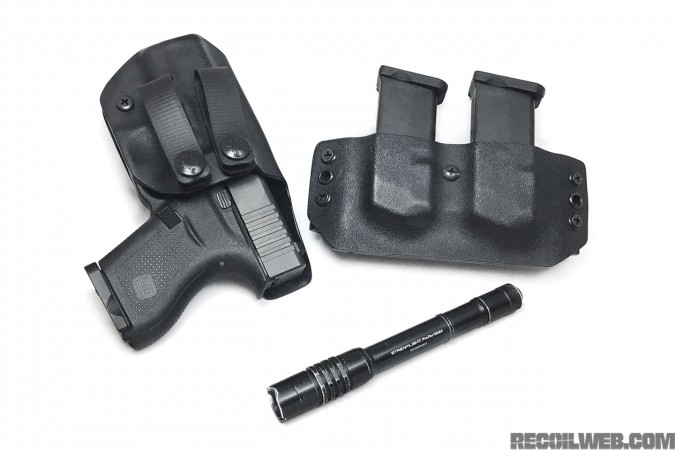 Featured Monday Morning Carry: Glock 43 Served Two Ways Recoil Staff September 5, 2016 Join the Conversation At RECOIL, we review every product fairly and without bias. Making a purchase through one of our links may earn us a small commission, and helps support independent gun reviews. Read our affiliate policy. Find out more about how we test products. The diminutive Glock 43 became an EDC of choice for many soon after it premiered back in March of 2015. The quintessential ‘Gun for when you can't have a Gun‘ can be matched with a variety of holsters and gear (see our holster roundups here and here). Today we bring you two different approaches to this pint sized pistol. Monday Morning Carry: Glock 43 Served Two Ways EDC Loadout 1. The Girls Have It Though it caused some controversy in the past, especially when one woman accidentally took her own life last year, the Flashbang holster remains an attractive option for those in the population that regularly wear bras. We're not so sure that one incident warrants disregarding the entire carry methodology, and it certainly remains a salient example of the need for good training. Fear not if you're a man who doesn't wear a bra–maybe one day the ‘Bro' as foretold by Frank Costanza will come to fruition. The spare magazine is in a Blackpoint MAP holster and the knife accompanying this Glock 43 is a Benchmade Mini Auto Stryker. For a less-lethal option, Sabre Red rides in the pocket. A SOFTT-W tourniquet rides in a Tac Med soft ankle holster. EDC Carry Loadout 2. Like Normal, but Smaller There's a joke someplace in this title, we just have to break out a magnifying glass to find it. This loadout is set up in much of the same way as a ‘normal' pistol. The Glock 43 is rolling in a We Plead the 2nd IWB holster with an XP sweat guard. The magazines all feature KE Arms billet aluminum basepads for some extra help getting your little grubbies on them during reloads. The pocket light is a slimline Streamlight ProTac that runs on 2 AAA batteries. Though you're not going to blind someone or signal Batman with this 80 lumen light, it tucks well and should be AOK for most administrative tasks that we actually [mostly] use lights for. What do you carry, and why? Looking for more Monday Morning Carry or EDC related posts? More images of EDC loadouts here: http://tinyurl.com/RECOIL-EDC-Series. All EDC articles can be located in one central place right here: http://tinyurl.com/mondaymorningedc. Why you can trust RECOIL Since our founding in 2012, RECOIL remains the premier firearms lifestyle publication for the modern shooting enthusiast. We deliver cutting-edge coverage of guns, gear, accessories and technology. We go beyond basic reviews, providing no B.S. buyer’s guides, hands-on testing and expert analysis on everything from firearms and survival equipment to watches and vehicles. Our reviewers are the backbone of our operation and come from diverse shooting backgrounds: Former law enforcement, military veterans, competitive shooters, seasoned hunters and plain old firearms enthusiasts. Furthermore, we’re not just gun experts, but dedicated journalists who adhere to the strictest standards of our profession. At RECOIL, editorial independence is the foundation of everything we publish and the cornerstone of reader trust. Our editors, writers and content creators make all editorial decisions independently, free from outside influence. That boils down to: advertisers don’t dictate our coverage, the outcomes of our reviews or what we recommend in our buyer’s guides. First and always, our commitment is to our audience—ensuring every review and article is accurate, unbiased, and driven by real-world experience. Whether you’re selecting your next firearm, upgrading your gear, or exploring the latest innovations in the shooting world, RECOIL provides the trusted insights you need to make informed decisions. Learn more about our Editorial Standards and how we review products. NEXT STEP: Download Your Free Target Pack from RECOILFor years, RECOIL magazine has treated its readers to a full-size (sometimes full color!) shooting target tucked into each big issue. Now we've compiled over 50 of our most popular targets into this one digital PDF download. From handgun drills to AR-15 practice, these 50+ targets have you covered. Print off as many as you like (ammo not included). Get your pack of 50 Print-at-Home targets when you subscribe to the RECOIL email newsletter. We'll send you weekly updates on guns, gear, industry news, and special offers from leading manufacturers - your guide to the firearms lifestyle.You want this. Trust Us.