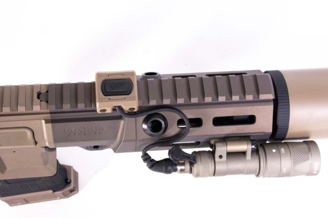 Both the upper and lower receivers are meticulously machined from bar stock. The upper retains the forward assist feature and has a notch cut into the forward Pic rail slot in order to accept an anti-rotation tab located on the handguard, but apart from its flawless tool paths and excellent surface finish is otherwise pretty standard. Handguard-wise, the MDX looks like it’s sized to tuck the can inside, and while a small portion of the suppressor does indeed fit underneath, its 2¼-inch diameter matches the OD of the chunky exposed portion. Anti-rotation QD sling sockets are on both sides, and our test subject came fitted with a hand stop — essential if you’re planning on retaining your epidermis.