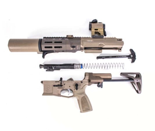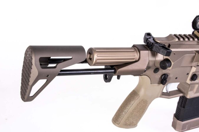 Due to design constraints imposed by its size, field stripping deviates from what you’d expect. Instead of shotgunning the action open like in a regular AR, both takedown pins are punched, and the two halves separate, spilling the abbreviated buffer and spring. There’s no buffer retainer, and the bolt carrier’s tail is chopped down to accommodate an abbreviated buffer which is all steel, in order to maintain the necessary mass.