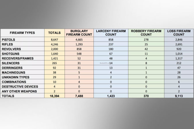 Industry News More Guns Stolen: ATF Releases 2016 Firearm Loss/Theft Report Industry News April 12, 2017 Join the Conversation At RECOIL, we review every product fairly and without bias. Making a purchase through one of our links may earn us a small commission, and helps support independent gun reviews. Read our affiliate policy. Find out more about how we test products. More than 18,000 firearms were lost or stolen from gun dealers last year in the United States, at least according to the latest ATF report hosted by RocketFFL. The BATFE compiled this data from the Firearms Tracing System (FTS) system. The total number of lost and stolen firearms in the United States for 2016 is unknown at this time–but it would be significantly higher. Between 2005 and 2010, according to the Bureau of Justice Statistics, more than 1.4 million firearms were reported stolen (over 230,000 per year). Those numbers from the BJS may be too low, as reporting a stolen firearm is not legally obligated in every state, nor does everyone follow the law. However, FFLs are legally required to report a lost or stolen firearm within 48 hours to the National Tracing Center so this report is probably fairly accurate. The ATF breaks down the numbers to category of firearm and type of loss. We did find it a little strange that derringers have their own category. RocketFFL notes: Compared to the ATF’s 2015 Theft/Loss report, that’s a 124% increase in the total firearms reported lost/stolen (14,800 in 2015), a 150% increase in the number of firearms stolen (6,163 in 2015), and a 105% increase in the number of firearms lost (8,637 in 2015). The report continues by breaking down all of the information state-by-state. You can check out the full report here. @DM Why you can trust RECOIL Since our founding in 2012, RECOIL remains the premier firearms lifestyle publication for the modern shooting enthusiast. We deliver cutting-edge coverage of guns, gear, accessories and technology. We go beyond basic reviews, providing no B.S. buyer’s guides, hands-on testing and expert analysis on everything from firearms and survival equipment to watches and vehicles. Our reviewers are the backbone of our operation and come from diverse shooting backgrounds: Former law enforcement, military veterans, competitive shooters, seasoned hunters and plain old firearms enthusiasts. Furthermore, we’re not just gun experts, but dedicated journalists who adhere to the strictest standards of our profession. At RECOIL, editorial independence is the foundation of everything we publish and the cornerstone of reader trust. Our editors, writers and content creators make all editorial decisions independently, free from outside influence. That boils down to: advertisers don’t dictate our coverage, the outcomes of our reviews or what we recommend in our buyer’s guides. First and always, our commitment is to our audience—ensuring every review and article is accurate, unbiased, and driven by real-world experience. Whether you’re selecting your next firearm, upgrading your gear, or exploring the latest innovations in the shooting world, RECOIL provides the trusted insights you need to make informed decisions. Learn more about our Editorial Standards and how we review products. NEXT STEP: Download Your Free Target Pack from RECOILFor years, RECOIL magazine has treated its readers to a full-size (sometimes full color!) shooting target tucked into each big issue. Now we've compiled over 50 of our most popular targets into this one digital PDF download. From handgun drills to AR-15 practice, these 50+ targets have you covered. Print off as many as you like (ammo not included). Get your pack of 50 Print-at-Home targets when you subscribe to the RECOIL email newsletter. We'll send you weekly updates on guns, gear, industry news, and special offers from leading manufacturers - your guide to the firearms lifestyle.You want this. Trust Us.