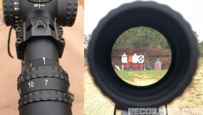 Competitive Shooting Hands On with the Nightforce ATACR 7-35×56 Scope Candice Horner March 29, 2018 Join the Conversation At RECOIL, we review every product fairly and without bias. Making a purchase through one of our links may earn us a small commission, and helps support independent gun reviews. Read our affiliate policy. Find out more about how we test products. The Nightforce ATACR 7-35×56 F1 is the crème de la crème of long range and extended long range precision scopes. I was recently sent the ATACR 7-35x to test and hopefully run for an upcoming Precision Rifle Series (PRS) match. The only catch was I had about four hours to give the scope a quick down and dirty assessment to determine if it could be used for the match. In four hours, I zeroed, tested its elevation tracking ability, abused it a bit to make sure it would maintain zero when bumped around, and shot out to 1300 yards. With every new scope, you have to test it– not just zero. Doing so will build confidence in your weapon system by knowing the rifle is set up as well as possible and any misses are likely user error. ZEROING Zeroing the Nightforce ATACR is one of the easiest scopes I've zeroed. Past the point of confirming POA and POI were the same at 100 yards, adjusting the ZeroStop was fast and simple. After partially unscrewing two screws on the turret and pulling it off, the ZeroStop mechanism is revealed. I prefer to run all zero stops a little bit below zero. This is so I can dial under if I need to shoot side prone, or if confirming zero before a match requires me to dial lower. Being able to just slip the turret to zero is much easier than adjusting the zero stop. It's also beneficial if you zero without a suppressor on the rifle and plan to use one in the future; leaving room to account for suppressor shift when you need to re-zero. After setting the ZeroStop in my preferred position, I tightened down the four screws and popped on the elevation turret, making sure I had it lined up to “0” and then tightened the two screws that hold the turret. Next, I maxed out the amount of travel multiple times and rechecked zero. It was still dead on. After having an unfortunate experience with a scope's zero shifting by 2 mils at 100 yards after being placed on a barricade, I include hitting the scope with a rubber hammer to simulate it getting knocked around. This, by no means is scientific, but it's practical enough. First, I hit the scope on the left side in multiple places and then checked zero again. Still zeroed. Next, I did the same thing, but from the right side. And, once again, the zero had not shifted. ELEVATION TRACKING Long range FFP scopes allow for the option to either holdover or dial. I was previously using a scope with an H59 reticle, which is hard to beat when you need to holdover and account for wind during fast target engagements. But, this scope had the Nightforce Mil-C F1 reticle. Nightforce Mil-C F1 Reticle Initially, I felt anxiety not having a Christmas tree reticle because I like having the option to hold for elevation and wind. My worries quickly faded when I tried to recall how many times a PRS bolt gun stage required fast target engagements. Truth be told, there is more than enough time to dial for every shot during most PRS stages. For example, most stages have five targets at varying distances. Shooters are usually given 1:30 to 2:00 minutes to engage each target twice. Even if it takes ten seconds to get into the first position, you've still got 10 to 11 seconds per shot, and remember most of those second shots are a repeat shot. With my safety blanket mentality of the H59 getting chucked out the window, I had to make sure the scope's elevation tracked. Checking the tracking of the scope is imperative because you have to verify the internal adjustments match what the POI should be. If you dial up seven mils, it needs to be seven mils- not 7.4 or 6.6. A small discrepancy in tracking could make you believe there's an issue with any of the other several variables of your data. For that reason, when you check a new scope, only change the scope. Don't use a new rifle or ammo; use a rifle with known performance. This new scope was mounted on one of my most accurate competition rifles, a Surgeon Scalpel 591 Short Action, in a McMillan A-5 stock, chambered in 6XC. When testing tracking, most people will recommend doing the box drill, which tests the tracking of elevation and windage. Being strapped for time, I was only concerned with the elevation because I don't dial wind during matches. On a paper IPSC target, I put a half inch sticker at the 6 o'clock position. With the turret on zero, I shot at that sticker. Then, while looking through the scope, I measured how tall the target was at 100 yards from that initial impact. The target measured just over seven mils tall. This information showed me that I could dial just over 7 mils before my hits would be off paper. I dialed up 7 mils, aimed at the sticker at 6 o'clock and shot. Next, I measured from my POA to my POI using the reticle in the scope. It was exactly 7 mils. This means the scope's elevation tracked properly. I did the same thing for 6, 5, 4, 3, 2, and 1 mils. This same exercise can be completed at a closer distance or with a longer target, both of which would allow for greater elevation testing. FIELD OF VIEW AT 100 YARDS With every variable power scope, magnification and field of view have an inverse relationship. The higher magnification, the less field of view you'll have and vice versa. During a match, it's easy to get lost behind a scope if the magnification is high. I expect the sweet spot during a match to be between 10 and 20 power for most targets. The majority of targets during PRS matches are between 200 and 1000 yards. FOV on 7x at 100 yards FOV on 15x at 100 yards FOV on 35x at 100 yards EASE OF USE The knurled elevation turret is easy to grasp and rotate. The elevation clicks are audible and tactile; you can hear 