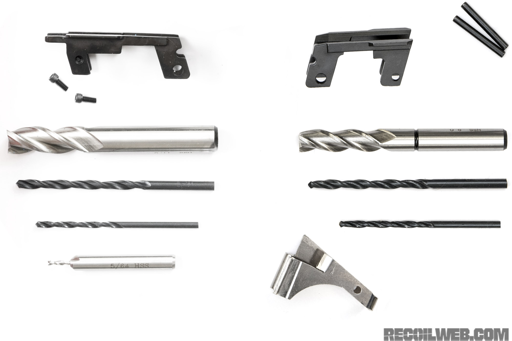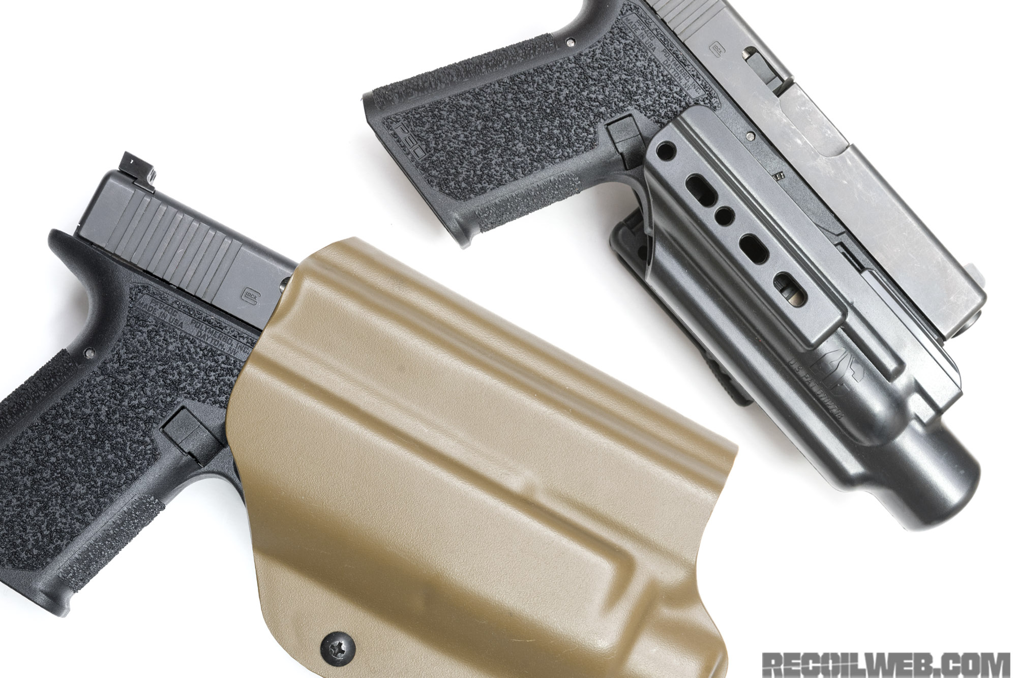 Featured Some Assembly Required: PF940Cv1 80% Compact Glock Frame Dave Merrill March 27, 2017 1 Comments, Join the Conversation At RECOIL, we review every product fairly and without bias. Making a purchase through one of our links may earn us a small commission, and helps support independent gun reviews. Read our affiliate policy. Find out more about how we test products. The PF940Cv1 80% Compact Glock Frame — Some Assembly Required Compact Polymer80 frame? Why, yes please — and here's why. Back in RECOIL Issue 28 we completed one (well, several) full size 80% Glock receivers from Polymer 80. If you don't happen to have that issue, the entire article can be found online right here. So naturally, when the compact frame versions were announced, we knew we'd have to get our hands on one. Polymer80 is making two different versions, the PF940Cv1 and the PF940Cv1 ReadyMod. Each model comes with significant upgrades of the sort many people send off their OEM Glock slides for; while the standard comes with aggressive texturing, the ReadyMod comes smooth for your own easy customization. Comparison Far from just shrinking down their full size Spectre, Polymer80 calls the PF940Cv1 a complete redesign–and they're not lying. Check out the comparison for yourself: The machining is also slightly different, as you can see from both the jigs and the included tooling To complete the Spectre, we found that clamps were needed to keep the jig on tightly. The compact model now has a locking tab on top to help keep everything tighter. Though we still ended up using a clamp on the bottom, it was a large improvement. Probably the single largest improvement between the two as far as ease of finishing is the inclusion of metal rails for the rear of the frame. By far the most tedious task with the Spectre was cutting and squaring the plastic rails–plus they didn't exactly inspire confidence in many end users due to the OEM frames having all-metal rails. Gone also are the screws for the locking block, instead opting for a steel pin. The rear housing is also held in place with a steel, rather than plastic, pin. Completion As with the full size version, we opted to use a drill press in conjunction with a small bench vise for the milling operations. Instead of one large area to mill, there are two smaller areas. Learning our lessons from the previous build (because it's certainly not due to an increase in skill), the holes in the frame itself were made with a cordless drill and a level as opposed to the drill press. Six different holes were made (three on each side) as opposed to completely drilling through all in one go. After that it's just test fitting the frame inserts. Of course and as usual, it's much easier to take away material than to add any. Like with the Polymer80 Spectre, you're going to need some parts to completely finish the PF940Vc1: Complete slide assembly, including barrel and recoil spring Trigger and trigger bar Rear housing assembly, including trigger spring, ejector in appropriate caliber, and connector Magazine catch and spring Slide stop lever Slide locking lever and spring Pins (trigger, locking block, but not the rear housing assembly pin) Most of the small parts are completely interchangeable with a full size Glock, with the notable exception of the slide lock spring. At the Range The completion of the PF940Cv1 itself proved to be very straightforward. Heading to the range we were pretty confident that it would be running with no issues and that (thankfully) turned out to be true. We ran both OEM and aftermarket slides, barrels, and springs without even a hint of malfunctions or sluggish operation. We once heard that no gun you build will truly work until you get some of your blood on it, and due to a slip of the hand this sacrifice was inadvertently made. Obviously it's the blood and not our machining prowess that made the success of this build possible. Upgrades Over OEM The Spectre offered some ergonomic improvements for some compared to a standard Glock 17 frame such as a beavertail, larger grip, and integral magwell, but it's very evident that the folks at Polymer80 went further with the PF940Vc1. They took those critiques and criticisms, as well as looking hard at the aftermarket, to offer up “custom” right out of the box. Though many complain that finishing a Glock 17 frame is more expensive than simply buying an OEM model on Gunbroker — we require no such excuse to build an 80% lower for the fun of it — the PF940Vc1 has advantages you'd pay a lot of extra money for. Let's start with the texturing. The magazine release bevel is also excellent. If you're the type to use extended releases, you may not require one here. You'll notice the distinct “Glock 19” shaped magwell instead of a large flared one like the Spectre. This is no accident, because if you have an aftermarket magwell that you like for your Glock 19 — it'll fit on here too. Other differences between an OEM frame include a full Picatinny rail, lack of finger grooves, undercut trigger guard, a “gas pedal”, and slightly more upright grip A noteworthy feature is a little embedded metal tab for engraving under the accessory rail. While this may seem unnecessary for the home builder, it really opens up manufacturers to start churning out their own frames to go with their custom slides. You'll likely see completed frames available on the market very soon. So How About Holsters? In the wide world of custom Kydex, a holster is probably just an email away–but what about what you already have? We tried several, and needless to say not all of them worked out. Light-bearing holsters may be a different story, however. Because holsters that can accommodate a WML usually secure on the light itself, we had some better luck there. The Safariland Pro-Fit GLS Holster did live up to its “universal” moniker, as you can see. Conclusions In the end, so long as you don't muck up the last 20% of this 80% lower, the ju