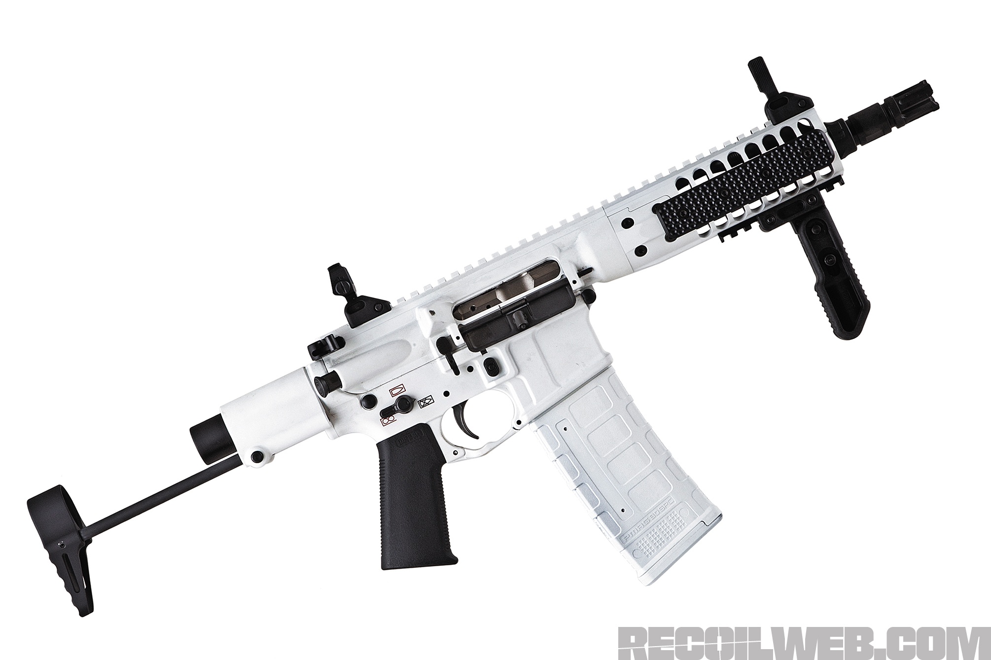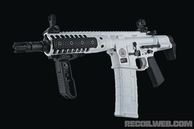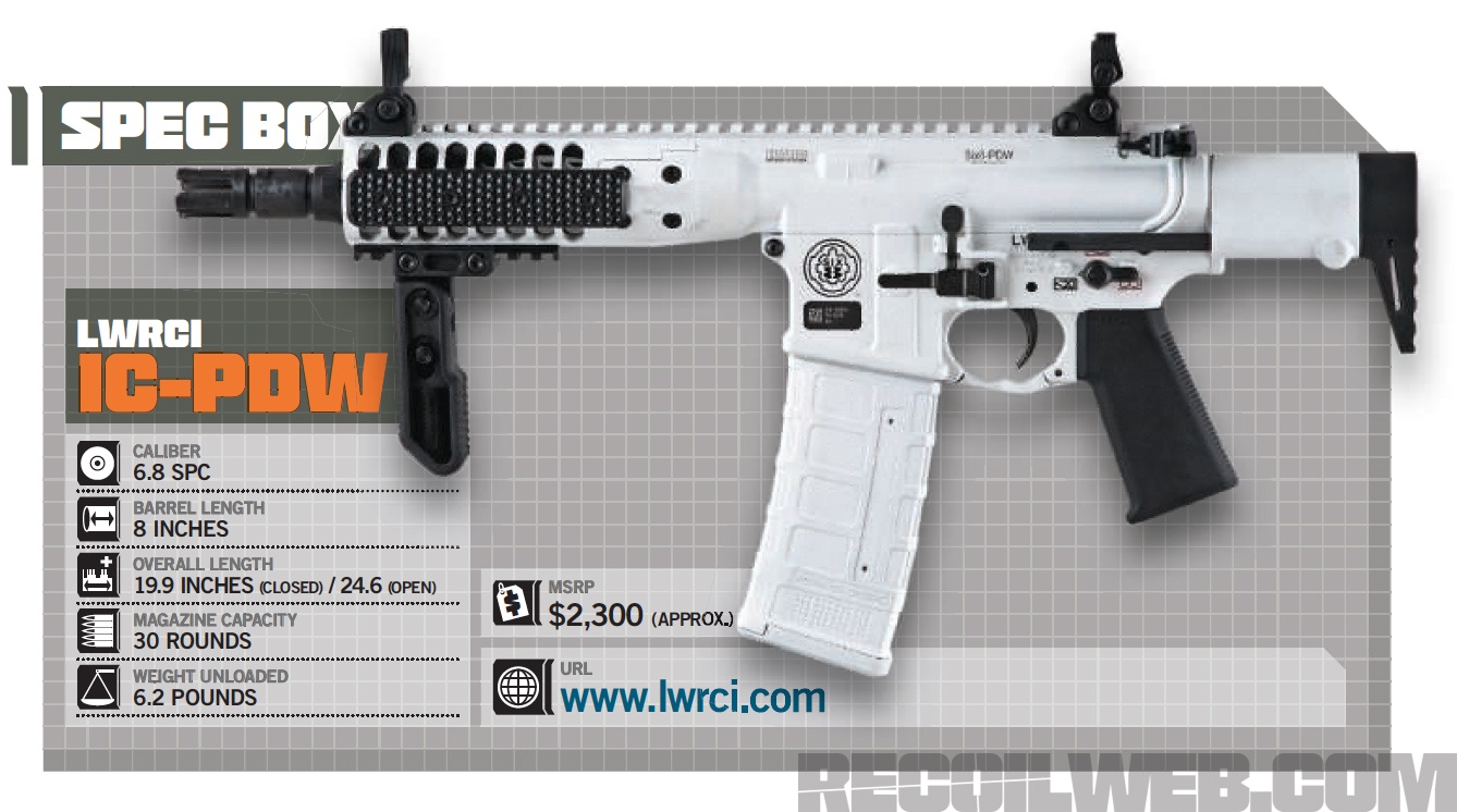 Guns Review: LWRC Six8 PDW Iain Harrison August 27, 2019 Join the Conversation At RECOIL, we review every product fairly and without bias. Making a purchase through one of our links may earn us a small commission, and helps support independent gun reviews. Read our affiliate policy. Find out more about how we test products. This article originally appeared in RECOIL Issue 11 Photography by Henry Z. De Kuyper The Empire Called. It Wants Its PDW Back. Hokey Religions and Ancient Weapons Are No Match for a Good Blaster at Your Side, Kid Have truer words ever been spoken? Mr. Solo sure knew what he was talking about. Look past the killer custom Cerakote job, and you’ll see LWRC’s take on what a personal defense weapon (PDW) should be. This is the civilian version of the sub-carbine purchased by the Saudis for internal security purposes. And it rocks. Over the past decades, the submachine gun has fallen out of favor for second line troops, and the PDW’s star is ascendant. The requirement to arm cooks and bottle washers with an adequate firearm that is smaller, lighter, and generally less capable than the standard-issue infantry rifle has led to some interesting developments. FN introduced the P90, which has seen limited international sales. H&K’s interpretation, the MP7, has found favor with troops that fall outside of its original intended audience. For example, SEAL teams have been employing it in raids on Al-Qaeda franchises in sub-Saharan Africa, due to its reliability, compact size, and controllable nature. And yes, I did just say “MP7.” Get over it. As its name implies, the Six8 chambers 6.8 SPC rounds, which ballistically exceeds that of the 5.56mm. Both firearms utilize a scaled-down cartridge, relying on extended magazines and full-auto capabilities to put enough lead on target. LWRC took a different approach. In conjunction with ATK Federal, who optimized the 6.8 SPC round for use in short barrels, the Maryland company came out with the Six8 IC-PDW, which offers rifle-level ballistics from a very compact package. Saudi Arabia sits at the crossroads of an extremely volatile neighborhood. While its politics may be decidedly antiquated by Western standards, it remains a key ally in the region, the loss of which would be disastrous for U.S. foreign policy. Following numerous attacks by domestic and foreign terrorist groups, the Saudis decided to get serious about their internal security forces (and drag them kicking and screaming out of their traditional, largely ceremonial role), putting them to serious work. Let’s face it, when your issued weapon is a gold-plated MP5K, there’s going to be chuckling whenever you walk into the room. The replacement for the aforementioned MP5 is the Six8. While not exactly a sawed-off elephant gun, its ballistics exceed that of a 5.56mm by a substantial margin. As evidenced by bruises left on my shoulder from range time, this thing has a decent thump on both ends. And while I wouldn’t volunteer to stand down range of any of the PDW cartridges, there’s no way in hell I’d go forward of the muzzle of this beast. Launching a 90-grain bonded softpoint at 2,400 feet per second (fps), it’s like the Tasmanian Devil of SBRs. Details, Details… The LWRC team has managed to pull off an impressive feat of engineering. Not only have they shrunk the AR to very compact dimensions, they also made it run reliably with a bigger round. To achieve this, they ditched the direct impingement operating system in favor of a short-stroke piston housed under the handguards. The usual recoil spring and buffer located in the butt have been redesigned. The buffer is now part of the bolt carrier and, in addition to being reduced in size, contains a second, auxiliary spring and sits inside the rear of the carrier. This has the effect of absorbing some of the force as the assembly impacts the end of the chopped-down buffer tube. The main recoil spring has been swapped out for one made from flat wire, rather than the round stock typically found in the AR platform, in order to reduce the amount of space it takes up when compressed. The abbreviated receiver extension is achieved via a small buffer that sits inside the bolt carrier, a flat wire action spring, and a second auxiliary spring. The hobbit-sized buttstock telescopes open and closed. The gas system itself is a modified version of the one found on their full-size guns. It comprises a fixed piston that is part of the gas block, a movable cylinder which slides over it, a spring-loaded operating rod and a short connecting rod which bridges the gap between cylinder and op rod. The gas block’s location is dictated by the length of the cylinder and op rod, which no doubt caused some head scratching regarding gas-port diameter, as pushing it this close to the muzzle reduces dwell time considerably. That the gun functions as well as it does is a testament to the amount of development work by LWRC’s engineers. Because of these changes, the field stripping procedure is decidedly non-standard. To tear down the gun, you first clear it and then punch out both takedown pins. In order to separate the upper and lower receivers, you have to pull out the recoil spring which is wound around the rear of the buffer (itself attached to the bolt carrier) as the upper and lower come apart. Although the process is considerably more involved than a regular AR, the good news is that the carrier and bolt stay much cleaner due to this being a piston-operated gun. Now that the upper and lower are apart, you can turn your attention to the gas system. Unscrew the two knurled and slotted thumbscrews at the front of the handguards. The upper section of the free-float tube can then be slid forward and off, revealing the gas system beneath. Push back on the op rod and remove the connecting link. Slide off the gas cylinder and pull the op rod free of the upper receiver. You can now scrape carbon from the piston exterior and out of the cyli