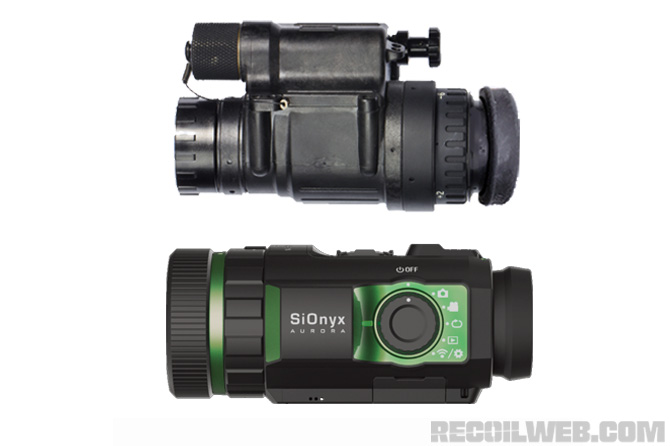 Gear Sionyx Night Vision Camera at Outdoor Retailer Kel Whelan July 24, 2018 1 Comments, Join the Conversation At RECOIL, we review every product fairly and without bias. Making a purchase through one of our links may earn us a small commission, and helps support independent gun reviews. Read our affiliate policy. Find out more about how we test products. If you've been waiting for the opportunity to use the phrase “It's like a PVS-14 and a GoPro had a baby that wasn't color blind,” then today is your chance. The Sionyx Aurora Night Vision Camera, the “possibly coming-soon” darling of Kickstarter pre-orders, goes up for real-world sale this week. RECOIL was one of the first outlets to get some hands-on with the device, and it's impressive. Half action-cam, half super-sensitive low-light color monocular, the Aurora is a curious result of an overactive wish list. Do you want to video a midnight hog hunt or do surveillance at night? Do you want a waterproof action camera small enough to squeeze into all the usual small-cam snowboard/skiing/motorsports places? But you've also always wanted night vision that has real color capabilities — instead of the harsh green TV you're used to in NV goggles and scopes? This camera purports to do all that, and at an affordable price for NV (or a not-too-high price for an action cam). While color night vision has been played with for ages, such as the interesting work Tenebraex did almost fifteen years ago, and historical attempts at digital night vision products have mostly fallen flat (I'm looking at you, Xenonics SuperVision), today's tech has pretty much caught up with the wish list. Digital camera sensors have gotten to the point to where some DSLRs and mirrorless cameras can pull in ISO numbers of 400,000 or so. Which, if you don't speak camera-nerd, is basically gathering enough light to see in the dark. With a fat stack of 40 patents, some Ivy-league geeking and tweaking of the sensors, and the will to make night into day, the Sionyx unit will do double that ISO number, sucking in impressive 800,000 ISO ratings. The teeny (yet very good) sensor and lenses in most action cameras can record nice video, but don't do well at all in low light. Which is why so many GoPro commercials are of snowsports, filmed on dazzling white ski hills — a gazillion lumens of sunshine-on-snow shows cameras at their best, big time. Conversely, the Sionyx unit's brag point is that it works very hard in the dark to grab every available bit of ambient light and the color cues that are hard to see and boost the heck out of them with its sensor and software. For an obvious comparison of what the Aurora brings to the low-light gathering game, check out the size of its 1-inch optical format chip as compared to a normal action cam's sensor below: Even though it's not the same thing, people are going to compare the Aurora to industry-standard NV monoculars. When asked to list some pros and cons of an Aurora vs. a PVS-14 (which is about the same size class), Sionyx's CMO Dan Cui immediately got it out of the way that a Gen 3 PVS will see better in pure darkness/moonless environments. The Sionyx unit doesn't have a built-in IR or visible light source like a PVS-14 does to perk up a dark room. However, on the pro side, it does things the PVS-14 never dreamed of doing: it records 720p video, has a color sensor displaying on an OLED screen, instead of monochrome green or white-phosphorus, Ip67-Grade waterproofing, and it has image stabilization. There's also added features via their smartphone app: using the camera's onboard GPS tech to locate friends or teammates, the ability to take compass bearings, or even broadcast night vision video live via your smartphone and it's built-in wifi. Oh, and there is that huge point that it sells for $799 before discounts. “Why not 1080p?” is a frequently asked question. Remember that big ol' chip a paragraph ago? To output 1080p with this camera's level of light gathering, a system would require a chip twice as big (a 2-inch sensor) and correspondingly huge lenses. Which would make the unit decidedly larger and pricier. Remember, their system is all about collecting light that's ambient or otherwise present, not shining IR or illuminators to spark up a picture as traditional NV does in super-dark near-field environments. Of course, you can always mount up an IR torch to your weapon or tripod if you want to get even brighter and less grainy video. Digging in, here are the specs of the camera: Since this is RECOIL, we know our readers have a big thought-balloon over their heads right now, asking “Is it weapon-mountable?” The answer is yes, or at least “soon.” Sionyx showed us a prototype 1913-spec rail adapter that they've already tested a bit on 5.56mm carbines. And doubtless, there will be aftermarket solutions to adapt the camera to other standards like M-LOK, standard NVG helmet mount interfaces, and all those sorts of things that get the readership here all twitchy over. There's no firm word on max recoil rating, but since these guys are all about doing their electrical engineering due-diligence, they not only shot some swine with it, they did mount it up to an M4 carbine recoil simulator. The Aurora took roughly 4000 rounds on the simulator before showing wear on the camera. Sionyx has a separate Sportsmans YouTube channel that has a video showing the unit's basic promises and capabilities. One video shows them using it on a hog hunt, mounted in front of a traditional day scope. This is achieved same as you would with a traditional clip-on NVD: mounting it up in front of the scope and then dialing in the camera's eyepiece diopter to focus with the magnified optic. If you want to use it alone as a big unmagnified Aimpoint-TM-type setup, there's also an illuminated reticle of sorts – made for boaters to find the horizon. But the crew at Sionyx says there should be no problem coming up with a true gunsight reticle upgrade