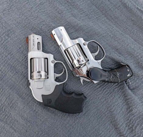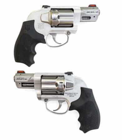 The SDR-A (left) not only shows aesthetic changes by being hammerless, but the brushed aluminum frame is decidedly different than the polished steel (right). (Yes, we added that old-school carry grip to the SDR.)