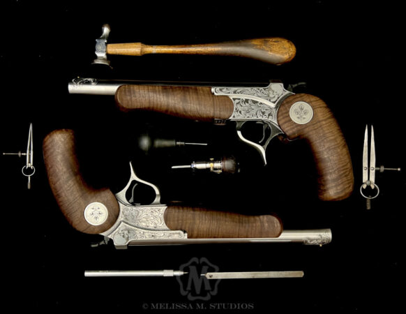 Reviews The Guns Of John Wick: Chapter 4 Mike Searson July 28, 2023 1 Comments, Join the Conversation At RECOIL, we review every product fairly and without bias. Making a purchase through one of our links may earn us a small commission, and helps support independent gun reviews. Read our affiliate policy. Find out more about how we test products. GUN WICK-IPEDIA Photos by Mad Pig Customs, Melissa McMinn, Haley Press, and Akita Yasunari Hollywood is notorious for flubbing details on firearms. We’ve all seen suppressed revolvers, repeated “hammer falls” on Glocks, handguns being aimed with the slide to the rear, and magazines that never need swapping. It’s enough to make any semi-knowledgeable firearm aficionado want to throw up their hands and say, “Can’t they ever get it right?” Every now and then, they actually do. Especially when you have an armorer like Rock Galotti working on the film, and guys like Taran Butler building guns and training actors for it. To be fair, most errors are caused by poor editing, inexperienced artists or sound people, or firearms randomly chosen because they look cool to the director. However, when they do get it right, we tend to notice. This is especially true when the firearms in question are custom or exotic, like they were literally ripped from the pages of RECOIL. John Wick: Chapter 4 is a perfect example of getting it right, while tempering what’s essentially a fantasy film. These exotic guns aren’t the tools of the trade for real assassins or hitmen, but in a world of make believe, they’re on point. Below are some of our favorites, and you can thank Galotti for the effort. GLOCK 34 (TTI COMBAT MASTER PACKAGE) At the start of the film, John Wick (Keanu Reeves) uses a Glock 34 pistol that has been customized with the Taran Tactical Innovations Combat Master Package. It includes a grip reduction with a single undercut, a full wrap stipple on the frame, and a TTI Full-Size Carry Magwell. The barrel is coated in a bronze Ionbond finish, and the slide is finished in a TTI Black DLC Coating, for a two-toned effect. A Timney Alpha trigger with TTI competition trigger job is installed, along with a TTI MOS standard height sight set with green fiber optic insert. It makes for a serious-sounding build sheet at the very least. And it’s actually one of the more affordable firearms from TTI, costing a little over $2,000 on a customer- supplied Glock. TTI PIT VIPER Later in the film, Wick receives a Pit Viper from the Bowery King, who describes it as a “9mm Pit Viper, 21-round capacity magazine with a built-in compensator for virtually no muzzle flip. Fiber optic front sight, ambidextrous safeties, flared magwell for faster reloads, 2-pound extreme trigger.” This is another TTI build that was created specifically for JW4 as the ultimate fighting pistol. Not only is this gun one of the most badass handguns in Hollywood history, but Taran sent it (incognito) to take the overall title at the first-ever USPSA 2-Gun Nationals in 2021. With a static fiber-optic front sight, large single-port compensator, DLC-coated match-grade barrel, ghost profile adjustable rear sight, Extreme Engineering LiteSpeed fire control group, Aftec Extractor, TTI carry magwell, extended slide release, extended and checkered mag release, DLC coated steel mainspring housing, and seamlessly blended beaver tail grip safety, it delivers reliability, accuracy, and ergonomics like no other. It has a traditional, full-wrap stipple rather than silicon carbide on the grip, along with a black DLC coating on the frame mated to a highly polished slide. Lastly, it features a built-in bladed stand-off, or fangs. There’s a 12-month wait for one of these, and the cost is $6,000. THOMPSON/CENTER ENCORE DUELING PISTOLS A pair of engraved Thompson/Center Arms Encore pistols are used by Wick and Caine (Donnie Yen) in a duel. The engraving was performed by Melissa McMinn and encompasses over 1,000 hours of work on these two pistols. Galotti, the master armorer on the film, came up with the idea for the base receiver of a Thompson/Center Encore with a bull barrel and gold bead front sight. Steve Parker of SAP Fine Furniture created the exquisitely figured walnut presentation boxes, as well as the trays in which a single round could be served to the duelists. Troy at Bullberry Legacy Barrel Works crafted the bull barrels with the gold bead front sights, rough cutting the grips and forends from the same museum-grade, figured walnut the boxes were made of. Rick at Fickle Pelican Woodwork helped to provide the finishing of the grips and forends, sanding, polishing, and oiling them to perfection. McMinn designed and drew all of the artwork and executed the engraving by hand, in deep relief. This included the baroque scroll and skull on the receivers, the custom designed fleur-de-lis grip medallion inserts, barrel engraving, and finally the round casings themselves. The artwork design was extensive and took well over 100 hours of drawing, brainstorming, changes of direction, and revisions before ultimately settling on a design to execute in steel, using that art in the two variations to differentiate the pistols slightly. A story old as time, good and evil, yin and yang, which is why one pistol features deep relief engraving inked in black, and the other a polished background for the skull and scrolling and hammered texture surround. To start the project, each receiver had to be surface prepped for the engraving, taking a bead-blasted receiver and finishing it, by hand, to 800-grit on all surfaces. Once the preparation was up to quality standards, McMinn sized her hand-drawn artwork to the proper dimensions and printed transfers of the art to apply to the metal. MARLIN 1894 LEVER GUN BY MAD PIG CUSTOMS The story of the lever gun seen in JW4 has some interesting turns. The production company needed rifles, and Marlin had recently gone out of business. Ruger bought the company but was nowhere clos