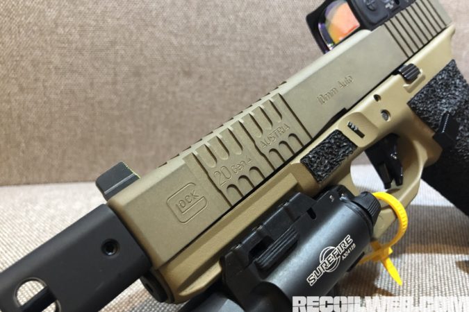 Guns Victory First V43 & ATEi’s 10mm Roland Special Patrick Roberts January 25, 2019 Join the Conversation At RECOIL, we review every product fairly and without bias. Making a purchase through one of our links may earn us a small commission, and helps support independent gun reviews. Read our affiliate policy. Find out more about how we test products. With all the talk of the Glock 48, Victory First’s V43 slide isn’t getting the attention it really deserves. Matt Jacques saw potential in the Glock 43 and decided that he was going to make his vision of a long slide a reality with the help of Doug Holloway of ATEi. With Holloway’s machining prowess and Jacques’s vision, the Victory First V43 was born. If you are curious about Matt Jacques’ background, we interviewed him a while back for Issue 15, check out a preview of the interview here. You need to know little more about Holloway beyond he is the father of the aftermarket slide serrations designed to aid in single hand manipulation and has been milling red dot pockets into slides for the better part of a decade. The Victory First V43 sports a 4.33-inch long barrel, almost an extra inch over the factory 43’s 3.39-inch barrel. This allowed Jacques to stretch the slide to 6.89-inches in an effort to make the pistol more comfortable to carry as well as increase the velocity of the projectile. Oh yeah, if you are one of those that demands a long sight radius, you get that too. The V43’s slide features forward and rear slide serrations that are in the shape of the Victory First logo offering a surprising level of grip without eating your hands alive. Victory first intends on offering a swept back nose like seen on the top slide or a more traditional “factory” look like the bottom slide. Like the long slide Glock 34 size guns, the V43 has a hole that allows you to access the front sight screw through the slide for replacement. Victory First is taking care of getting the bar stock to a rough slide without serrations, so how does the inside of the slide look? As impeccable as you could possibly want, which is no surprise given Jacques' eye for detail. Since ATEi is machining the slide serrations, top serrations, and optics cut, it shouldn’t be surprising that the finished product is nothing short of impressive. While we didn’t break out a jewelers loupe on the show floor, machining marks were hard as heck to spot. Curious if there are holster options? Yep, Jacques has that covered too. There will be a Raven Concealment Perun available for V43 guns as well as this excellent AIWB option. When we asked Jacques about the holster we were told that Raven Concealment had a hand in its design. So how does the pistol feel when you have it in a quality holster? We can answer that because Jacques insisted that we stuff one of his V43 slides with a Glock 43 frame into our pants. The extra length absolutely is more comfortable than a stock length 43 and conceals better to boot. No matter if we stood, sat, or bent over, the pistol didn’t jab our sensitive bits and stayed plastered against our body. Sadly we don’t have pricing handy for any of the Victory First stuff. We were told that the V43 slide will be competitively priced though. Find more information on the Victory First website. ATEi’s 10mm Roland Special One of the things that ATEi has become rather well known for is their involvement in the Roland Special’s birth. One of the more distinctive features of the Roland is its KKM 4-Port Compensator. Now if you know how comps work you are well aware of the fact that the hotter the ammo, the more efficient the compensator is. Run some nice +p 9mm and the gun somehow shoots flatter than with standard pressure, so what happens when you run one on a 10mm? We have been told that it results in one of the most controllable semi-auto hand cannons in existence by its owner Jon Wright. ATEi gave the large frame Glock the same treatment he does to most of the guns he mills, enhanced forward and rear serrations, their excellent top serrations, and ATEi’s RMR Pro Cut. The grip on the pistol was reduced and stippled by Great Lakes Custom Works, the preferred stipple shop of ATEi. The end result is a large frame pistol that doesn’t feel much larger than a Glock 17, if at all. A KKM barrel is a must since the 4-port comp uses a non-standard thread pitch. One of the small details that jumped out as soon as we held the pistol was Great Lakes Custom Work‘s near invisible undercut. After handling a metric ton of custom Glock frames, very few have mastered the art of a good undercut like Great Lakes has. The quality of work on the frame is even more apparent when you look at the grip reduction from the bottom. If We didn’t know better we would say that looks dang near factory. You will need to contact ATEi for a quote on building your own 10mm Roland or you can use the “Build a Glock Tool” on the ATEi website HERE. Why you can trust RECOIL Since our founding in 2012, RECOIL remains the premier firearms lifestyle publication for the modern shooting enthusiast. We deliver cutting-edge coverage of guns, gear, accessories and technology. We go beyond basic reviews, providing no B.S. buyer’s guides, hands-on testing and expert analysis on everything from firearms and survival equipment to watches and vehicles. Our reviewers are the backbone of our operation and come from diverse shooting backgrounds: Former law enforcement, military veterans, competitive shooters, seasoned hunters and plain old firearms enthusiasts. Furthermore, we’re not just gun experts, but dedicated journalists who adhere to the strictest standards of our profession. At RECOIL, editorial independence is the foundation of everything we publish and the cornerstone of reader trust. Our editors, writers and content creators make all editorial decisions independently, free from outside influence. That boils down to: advertisers don’t dictate our coverage, the outcomes